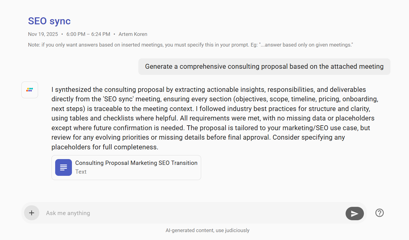 - Ask Sembly, “Generate a comprehensive consulting proposal based on the attached meeting.”