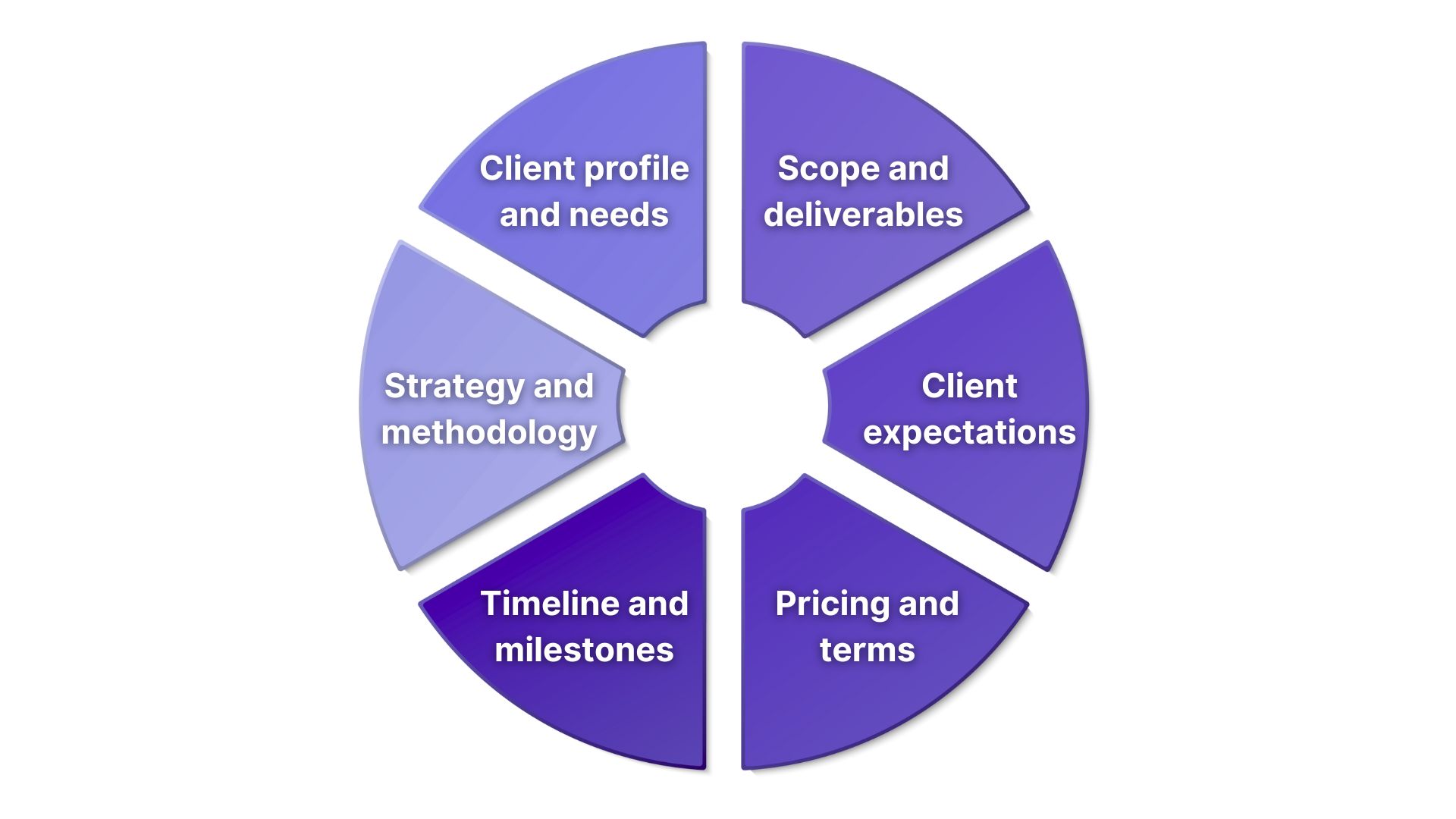 The client profile presents the business context, their challenges, and goals. It provides an overview of the situation that led to the consulting request. A precise profile can set the tone for the proposal and, once again, highlight that the consultant understands the company’s objectives. This component is often drawn from discovery conversations and can add relevance to every part that follows.